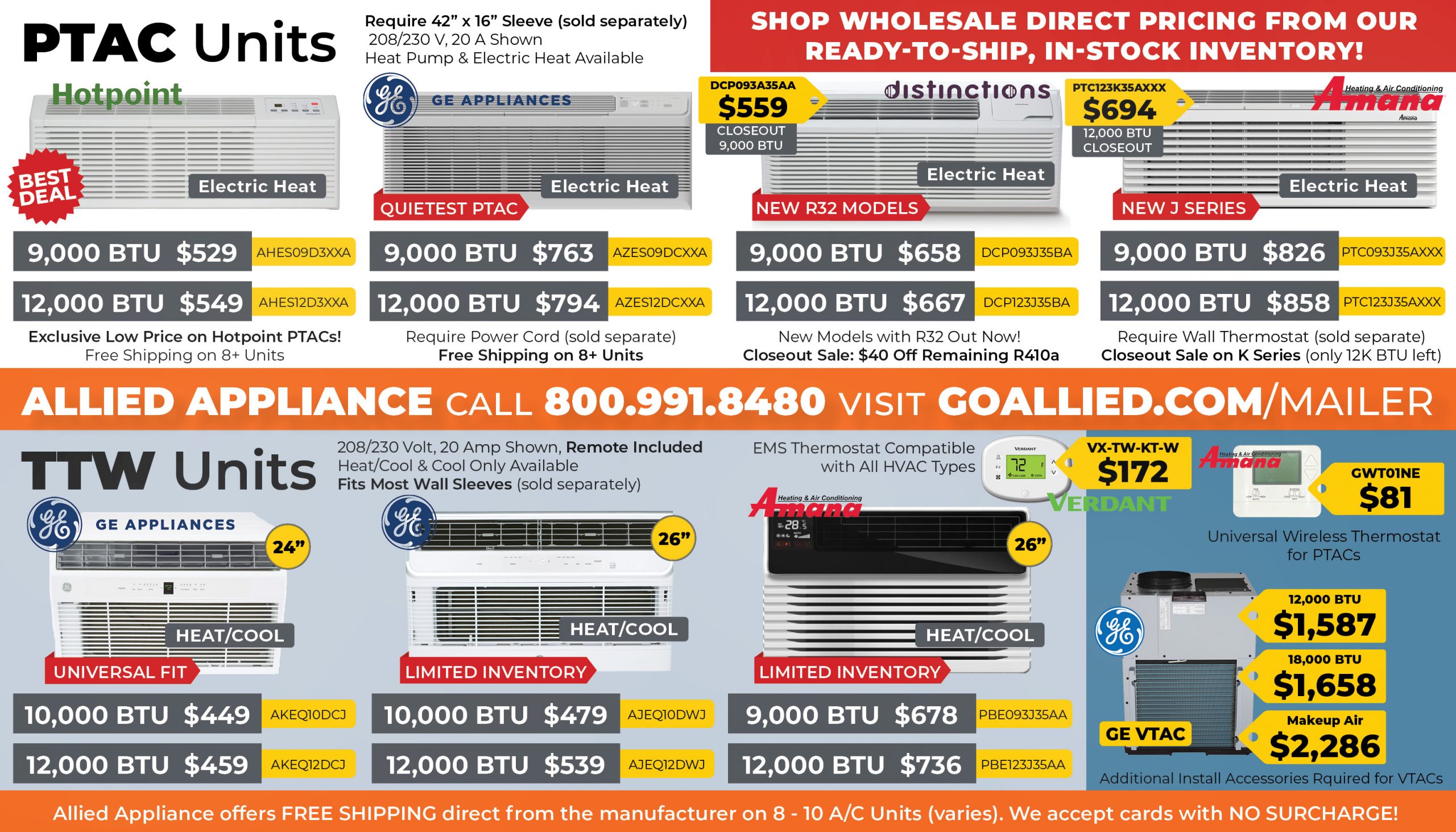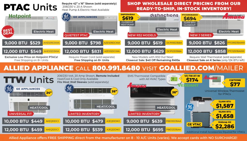 Electric heat PTACs shown. We offer FREE SHIPPING direct from the manufacturer on 8+ GE or Hotpoint PTACs and on 8 – 10 Amana or Distinctions PTACs (varies by state and brand). Discounts reflected in prices shown.